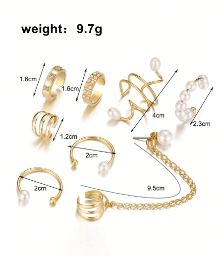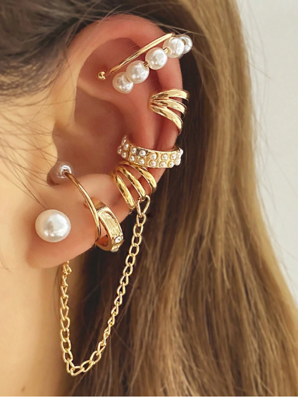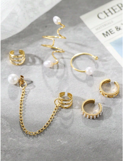 مجموعة من 8 أقراط بدون ثقب بسيطة وأنيقة مع سلسلة لؤلؤية