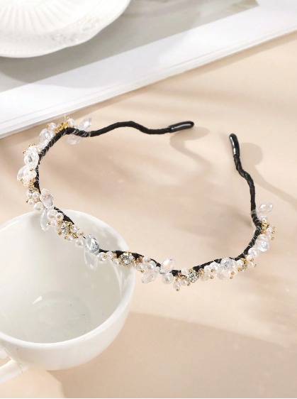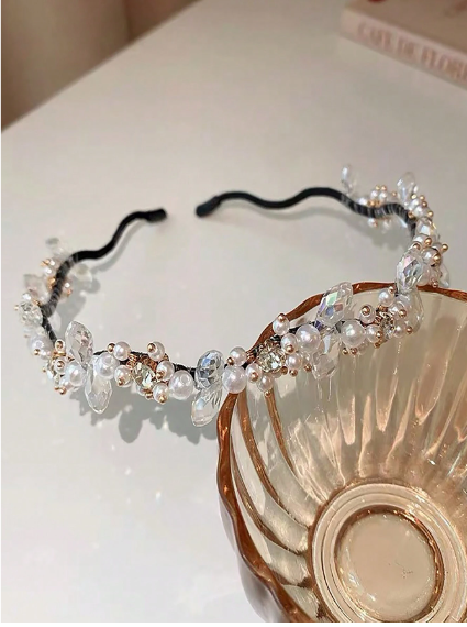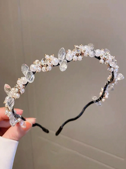 طوق شعر أنيق من اللؤلؤ وحجر الراين المصقول مع تصميم موجي من السبائك