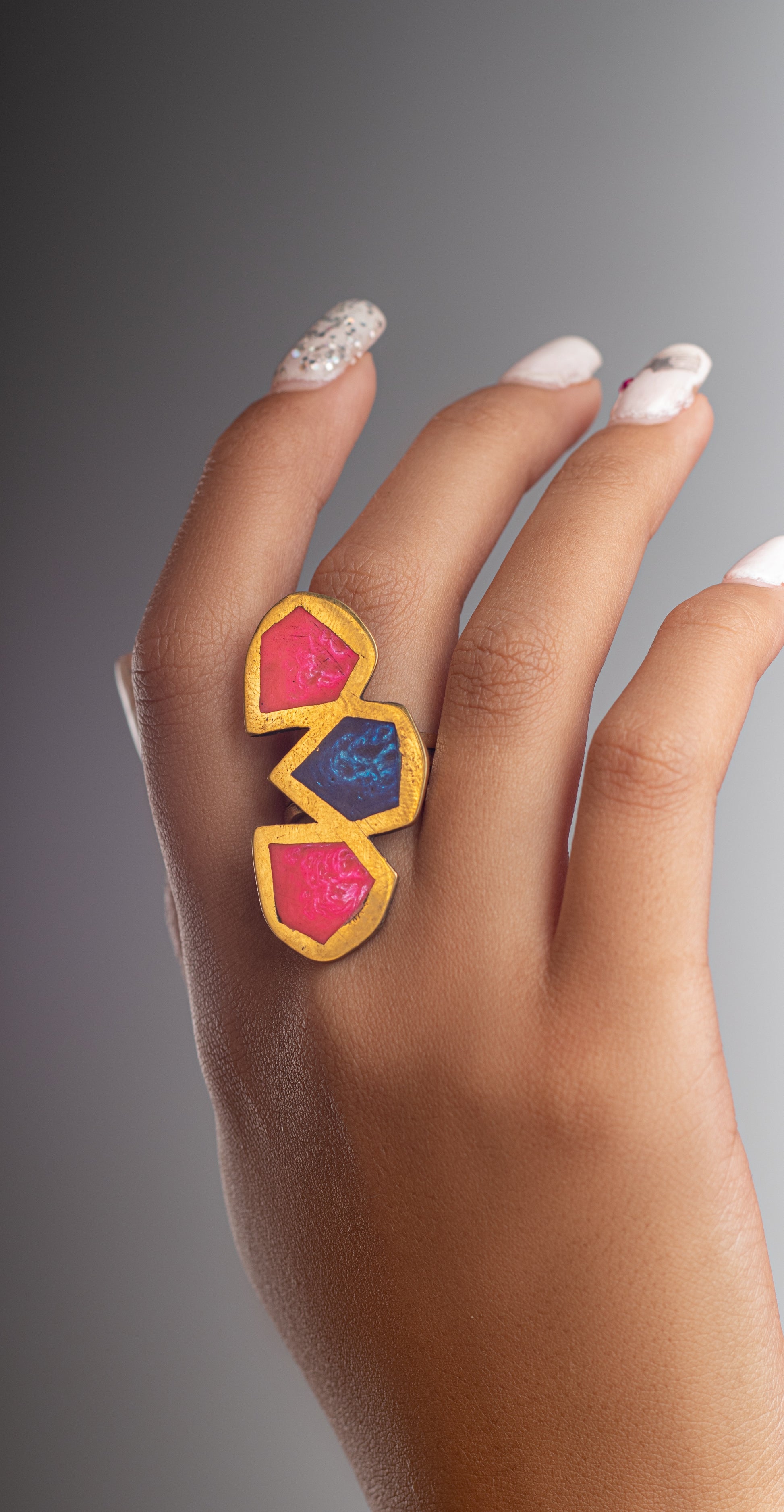 A chic set consisting of earrings, a ring, and a chain of colored stones